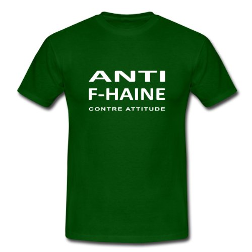 Spreadshirt, LOGO ANTI F-HAINE, Tee shirt classique Homme, vert bouteille, M?La France c'est: la Liberté, l'Egalité et le Fraternité. En conséquence pour nous et aux yeux du monde, la France n'a pas le droit de devenir un état de haine et de racisme. Vous êtes ANTI F-HAINE, alors ne le dites plus mais portez-le. Tee shirts. Le classique: ce tee shirt pour hommes à coupe droite est composé de coton filé pré-rétréci. La double couture en bas des manches, à la base et au col, garantit sa qualité et sa bonne finition. Confort garanti. Grammage: 190g/m². Composition 100% coton. Après confirmation de commande nous imprimons le produit individuellement pour toi. Ainsi, nous fabriquons des pièces uniques qui font vraiment plaisir à nos clients et soit dit en passant, nous préservons l''environnement.
